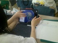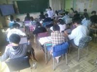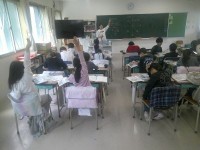 3年生が体育でベースボール型のゲームを楽しんでいました。攻撃側は台に置いた大きめのボールをバットで打ち、守備側がボールを押さえてみんなで集まったらそこでストップ。打った子が所定の場所をどれだけ往復したかで点が決まります。野球などより簡単なルール、進め方でみんな盛り上がっていました。