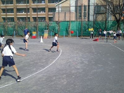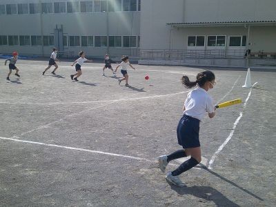 3年生が体育でベースボール型のゲームを楽しんでいました。攻撃側は台に置いた大きめのボールをバットで打ち、守備側がボールを押さえてみんなで集まったらそこでストップ。打った子が所定の場所をどれだけ往復したかで点が決まります。野球などより簡単なルール、進め方でみんな盛り上がっていました。