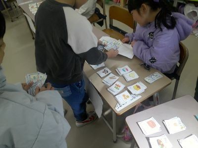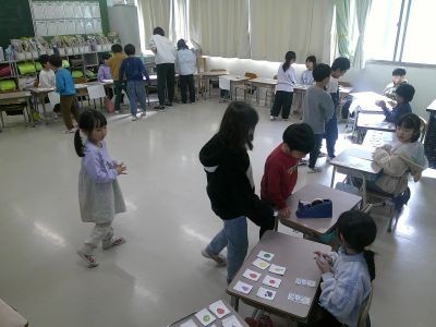 1年生が教室でおみせやさんを開いていました。半分の子は店側でカードに書いた品物を売ります。半分の子は客側で紙のお金で買い物をします。そのときどんなやり取りをすればよいのか。丁寧な言葉での会話を楽しむ国語の学習でした。