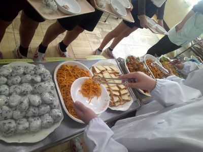 卒業を控えた6年生は、この時期、クラスごとにバイキング給食を行います。今日は6年1組。たくさん並んだ料理の数々。この日を楽しみにしていた子も多くいました。自分が食べたいものを必要な量だけとっていきます。みんなで輪になって座り、記念写真を撮ってから「いただきます」となりました。