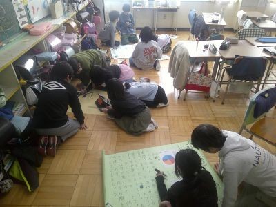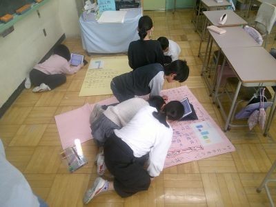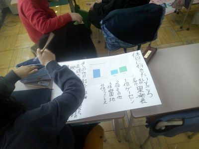 「好きなスポーツは?」「朝の過ごし方は?「好きな外食のジャンルは?」などテーマを決めてアンケートをとるなどして調べ、模造紙にまとめていました。4年生の国語です。友だちと協力しながら作業が進んでいました。
