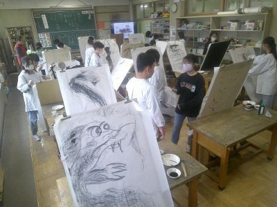 6年生の図工は水墨画です。いつもよりも大きな紙に墨と筆で描いていきます。竜の大きな動きを大胆に表現したり、細かなところをていねいに取り組んだり・・・。一人一人のイメージを墨の濃淡や筆使いなどで表そうと取り組んでいました。