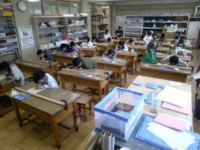 4年生の図工は版画。自分が表現したいものを板に描き、それを彫刻刀で彫っていきます。みんなとても集中し、安全に十分気を付けながら、ていねいに彫り進めていました。