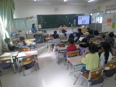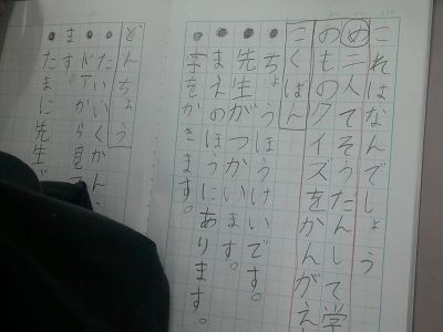 「筒のようになっています」「教室のどこにありますか」「前の方です」「どれくらいの大きさですか?」「小さいです」「いつ使いますか?」「授業で使います」「わかった!」。1年生が国語で教室にあるものを当てるクイズをつくり、みんなでやり取りしていました。問題も、質問も、その質問への答えもしっかりしていて、やり取りの様子もとても楽しそうでした。