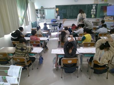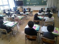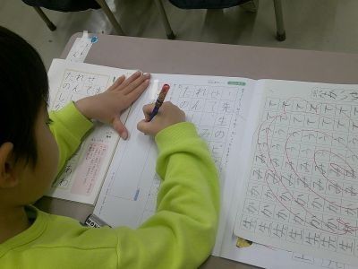 1年生の国語、書写の授業。正しい姿勢で、鉛筆の持ち方に気を付け、ていねいに文字を書いていくことがめあてです。気を付けることがいろいろですが、集中してがんばろうと取り組んでいました。