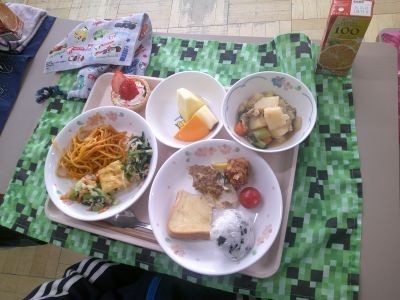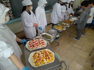 今日は6年2組のバイキング給食。子どもたちにとっては待ちに待った時間。早く取りにいきたいとうずうずしている子が何人も・・・。それに応えるだけの量を用意しています。先日終えた1組の子どもが「いいなあ」と廊下から覗いていました。