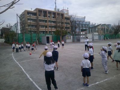 1年生が体育で取り組んでいたのはルールを簡易にしたドッチボール。投げる、逃げる、捕るなどの動きを繰り返し、みんなで大いに盛り上がっていました。