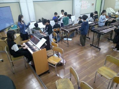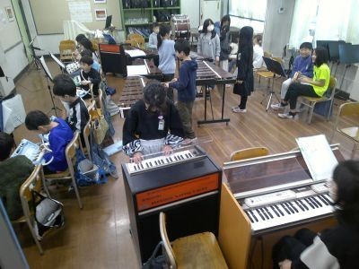 4年生が音楽で合奏の練習をしているのは「ラ・クンパルシータ」。パートで練習し、次に全体で合わせるという流れです。パート練習を続ける中で違うパートもそれに合わせ、それが広がり・・・自然に全体の演奏になって・・・子どもたちも楽しそうでした。