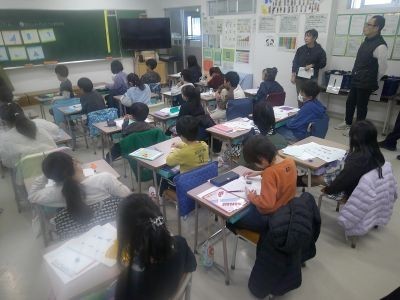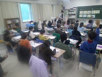 黒板に貼ってある何枚かの紙。正方形をいろんな形に分け、そこに色が塗られています。そこには当たりが何枚かある。1つ当たりを見つけると、何が当たりか気付く子どもが出てきます。2年生の算数、分数の学習。今日は1/4を取り上げていました。