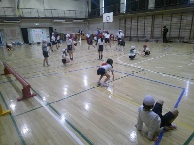 3年生の体育は体つくり運動。友だちと一緒になって体を移動する運動や、ボールを投げたりキャッチしたりする運動を楽しんでいました。ボールではフラフープを使いながら投げたりキャッチしたり、平均台の上でやったり、それぞれ自分で工夫していました。この授業は都内の何校の教員が研修の一環で参観に来ました。