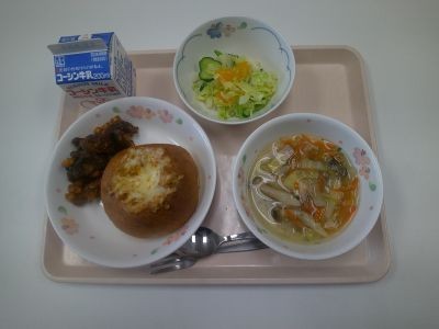 献立は、パングラタン、レバーのマリアナソース、フレンチサラダ、ジュリエンヌスープ、牛乳でした。