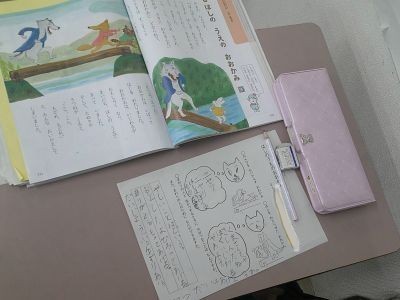 おおかみがうさぎたちに意地悪をする中、おおかみはクマに親切にされ自分の行為を振り返ってやさしい心をもつという話。1年生の道徳です。温かい、やさしい心について学習していました。