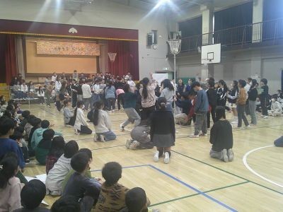 ダンスを交えたクイズなどが続く中、5年生はクラスごとに6年生との玉入れ対決。結果は・・・。1年生は6年生にかわいい手作りのメダルをプレゼントしていました。