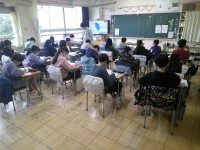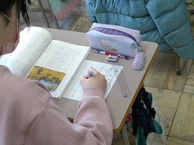 5年生が国語で読んでいるのは「大造じいさんとガン」。「秋の日が美しくかがやいていました。」などの状況の描写と、そのときの人物の心情との関係などに注目しながら読み進めていました。