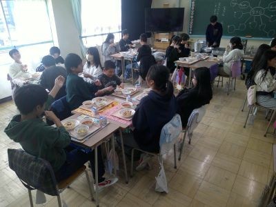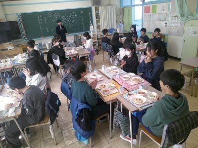 写真は6年3組の給食風景。整然と準備が進み、みんなの「いただきます」で食事が始まりました。