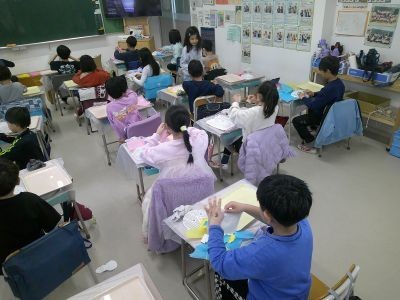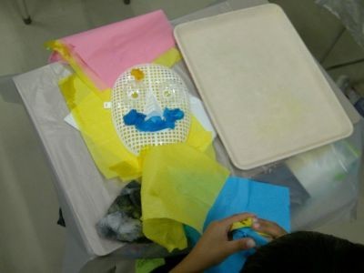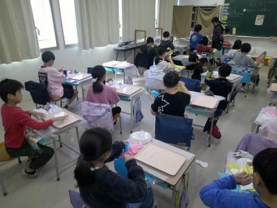 2年生の図工はお面づくり。顔のような型をもとに、そこへ何色かの花紙を、糊を使って付けていきながらだんだんお面にしていこうという活動。まずは単色で作り始める子、いろんな色を混ぜていく子・・・個性豊かなお面になりそうでした。