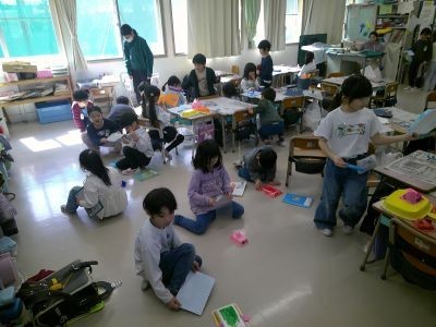 1年生の生活科。食品トレイに画用紙で風受けを付けるなどして、下敷きなどであおぐと動くおもちゃを作っていました。色を付けたり絵を描いたりして、できると友だちと一緒に動かして楽しんでいました。