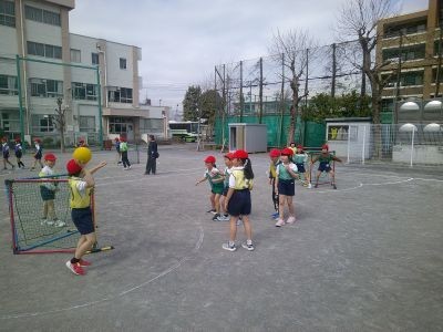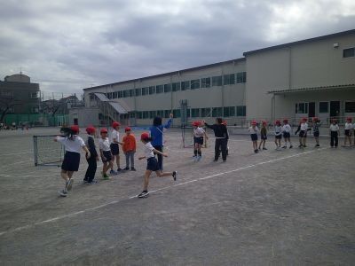 2年生の体育、まずは長縄。連続して跳ぼうとお互いに励まし合いながらチャレンジです。続いてボールを使ったゲーム。長縄の盛り上がりが続き、ここでもよく声をかけ合いながら体を動かしていました。