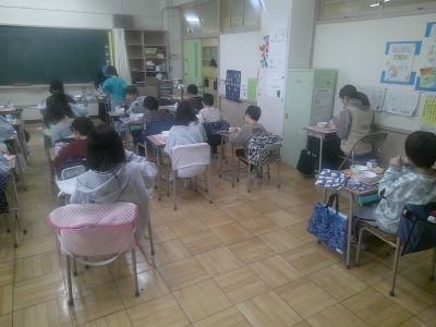 写真は3年2組の給食風景。静かに、整然と準備が進み、みんなで「いただきます」をして食べ始めていました。