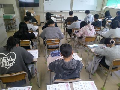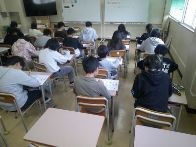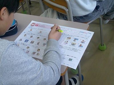 6年生の英語の学習。まとめのペーパーテストに取り組んでいました。英語を聴きとり、それをもとに答えるなどの問題にも挑戦。中学校での授業も視野に入れながらがんばっていました。