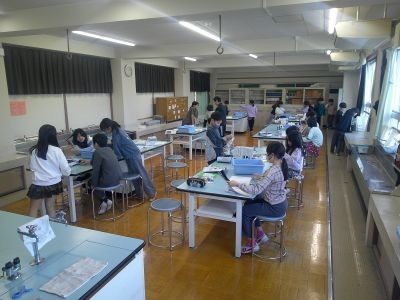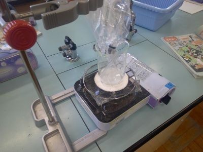 温めていく水の上部にビニル袋を置いておくと、水の温度の上昇とともに袋の中はどのように変化していくか。4年生の理科の実験です。沸騰しているとき、火を止めて沸騰をやめたときの変化などを観察しようとしていました。