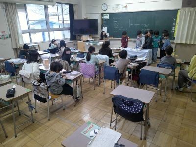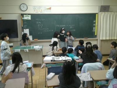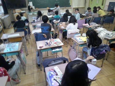 3年生は理科で、今まで学習してきたことをもとに手作りのおもちゃを作ってきました。その完成したおもちゃの紹介をしている学級がありました。どんなふうに遊ぶおもちゃか、作るときに苦労したところや工夫したところは、などについてみんなに説明していました。