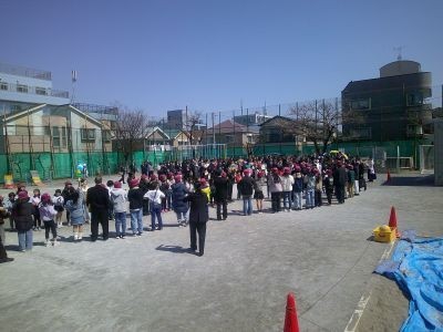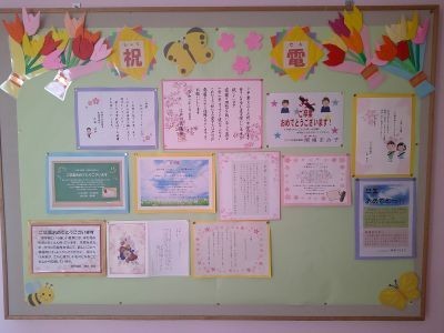 式後には体育館で学級ごとの記念撮影。体育館入口には祝電を掲示しました。学級での最後の時間を過ごしたのち、校庭に出て最後の「門出」、見送りの時間となりました。
