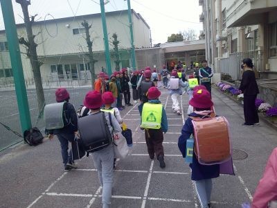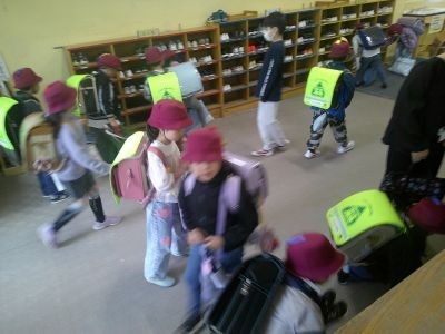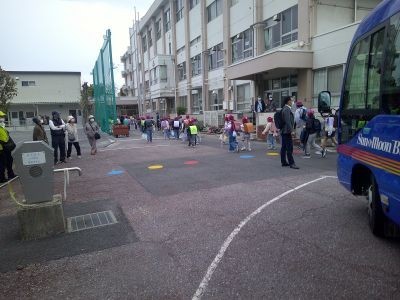 1年生も交えて子どもたちがスクールバスで登校してきました。ランドセルの黄色いカバーが目立ちます。5年生が玄関前で「おはようございます」と声をかけ、みんなを迎えました。靴箱で上履きに履き替えて教室へと向かいました。