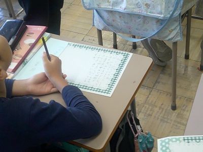 6年生が、卒業式前日の自分にあてた手紙を書いていました。1年近くが経ち、小学校を巣立っていこうとするときの自分をイメージし、6年生の1年間の振り返りをたずねたり、その先に楽しみなことなどを書いていました。封に入れ、卒業式前日に開くことになるようです。