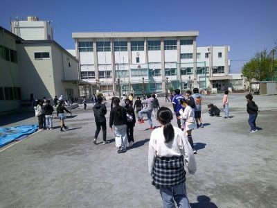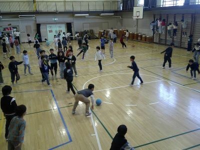 仮校舎では校庭の広さが限られているため、休み時間は学年別に交代で校庭や体育館を利用するようにしています。そうした中でも、担任も含めてみんなで外に出たり体育館にいったりしてみんなで遊ぶということに取り組んでいます。今日も青空の下、そして体育館で、元気に遊ぶ姿が広がっていました。