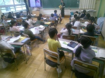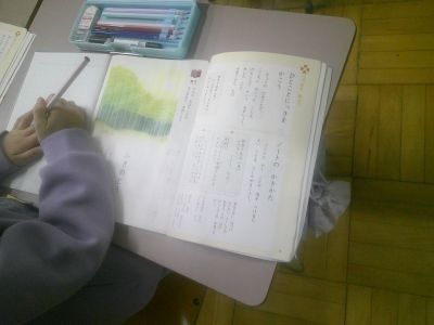 2年生が国語でひと言日記を書いていました。今日やったこと、見たことなど、今日の出来事で心に残ったことをひと言で書いてみようという学習。ノートに書くときに気を付けることも確かめながら取り組んでいました。