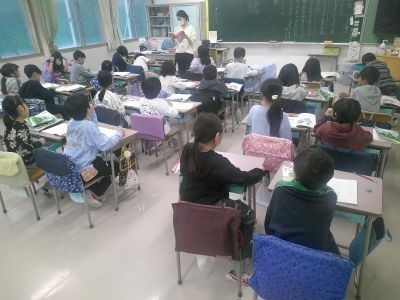 こんな日があったらいいなと思うこと。○○へ行く、△△をもらう、□□をお腹いっぱい食べる・・・。そんな夢のような一日を文章で表してみる。3年生の国語です。大きな大きな夢を書いている子もいて、みんなに紹介されると楽しい笑い声がおきていました。