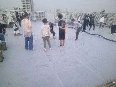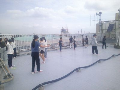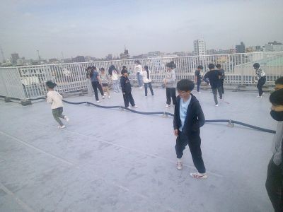 仮校舎での生活では、休み時間の校庭を交代で使用するなど外で遊ぶスペースが限られています。そこで校舎の屋上のスペースの有効活用も行っています。担任とともに屋上に行き、縄跳びや体力テストの練習をしている6年生の学級がありました。
