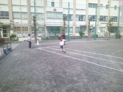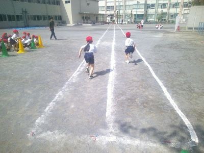 校庭で短距離走の計測をしている1年生の学級がありました。まずは真っすぐに走ること、そしてゴールの先まで全力で駆け抜けることが目標です。来月の運動会で走る姿を披露します。