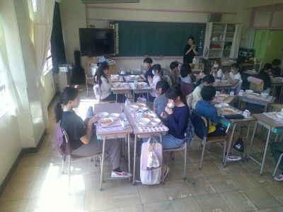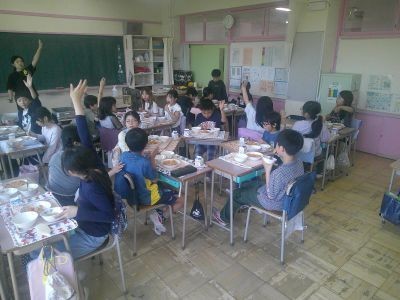 写真は5年3組の給食風景。穏やかな陽気が続く中、連日の春の食材を味わっていました。