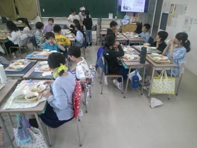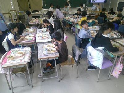 写真は3年1組の給食風景。当番の子どもたちの給食も協力して準備し、みんなで楽しい食事が始まっていました。