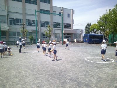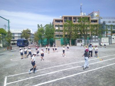 3年生の体育は投げる運動。丈の短いロケットのような形をした道具を使い、ネットの上の方に設けられた的を狙うなどして練習していました。経験の違い、個人差が大きいため、的までの距離を自分で選んで取り組んでいました。今月末から体力テストも行います。