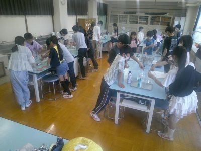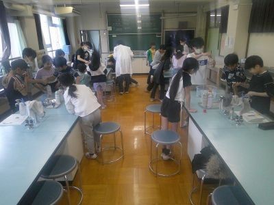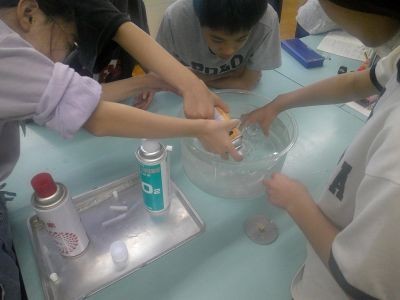 空気中にあるちっ素、酸素、二酸化炭素。この中でものを燃やすはたらきがあるのはどれか?6年生の理科の学習です。水槽の中で集気びんにそれぞれの気体を入れ、その中に火のついたろうそくを入れて変化をみる実験を進めていました。