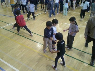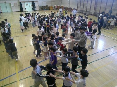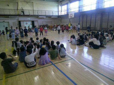 歓迎セレモニーは2年生からのクイズと続きました。そして1,2年生入り混じってのジャンケン列車。みんなでジャンケンを繰り返し、長い「電車」ができていきました。1年生と2年生、なかよく楽しく過ごしていくと思います。
