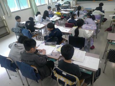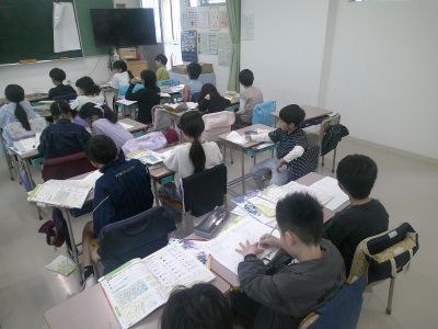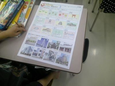 街の様子をよりわかりやすくするために、地図にはさまざまな記号などが使われています。社会の学習が始まった3年生で、その地図記号を取り上げていました。学校、病院、お寺など施設によって記号が定められていることを知り、どういう記号かを確かめていました。