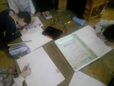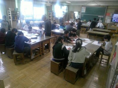 6年生が図工で取り組んでいたのは紙芝居づくり。グループごとに一之江小学校にちなんだ内容を考え、分担して絵を描くなどしていました。誰かに披露する機会があるといいなと思います。
