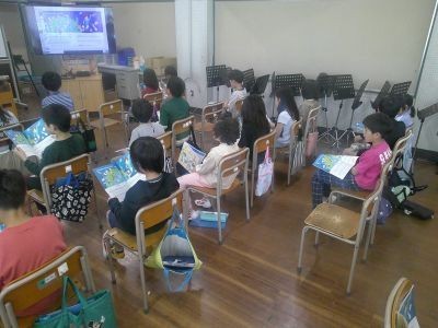3年生が音楽で歌っていたのは「小さな世界」。子どもたちがよく知っている歌です。これを2つのグループに分かれ、途中から違うパートを歌っていきます。それぞれ歌うところを確認して挑戦。友だちの声も聴きながら楽しく歌っていけそうです。