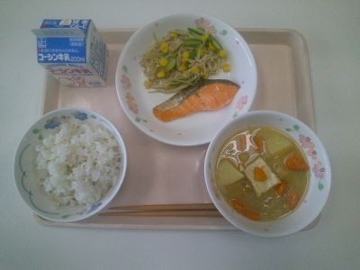 献立は、ごまご飯、鮭の塩焼き、アスパラベーコンソテー、新じゃがのごま味噌汁、牛乳でした。