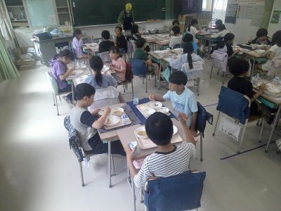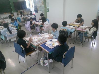 写真は3年2組の給食風景。ごまがたっぷりのご飯や味噌汁、しっかり育ったアスパラなどを元気に食べていました。