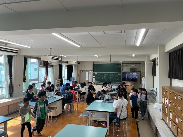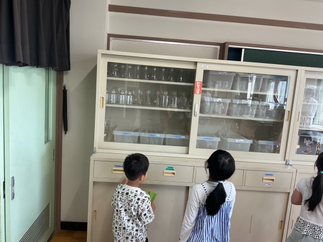 理科室に来ました。授業をしていますが、特別に入らせてもらいました。「3年生から理科の勉強が始まるんだよ」「いろいろなものがあるね」「何に使うんだろう」「実験とかするのかな」自分たちの教室とは違う様子に興味津々です。