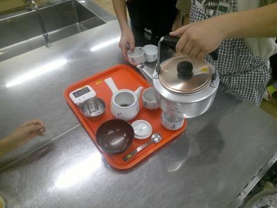 5年生が家庭科でお茶をいれるという活動を行っていました。お湯を沸かして少し冷まし、急須に茶葉を入れてそこに湯を注ぎ、しばらく待って湯呑に入れる。お茶はペットボトルが当たり前の時代。子どもたちにとっては新鮮な経験のようでした。