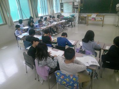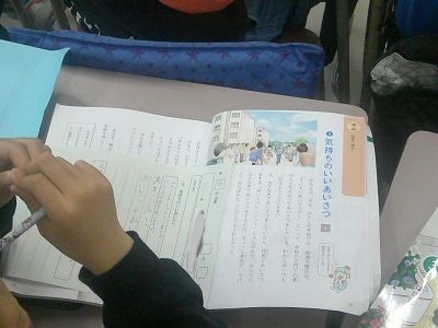 3年生の道徳で取り上げていたのは「あいさつ」。一之江小でもあいさつには力を入れており、学級ごと順番に、朝、バスを降りた友だちに「おはようございます」の声かけをするなどしています。気もちのいい毎日を続けたいと思います。