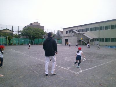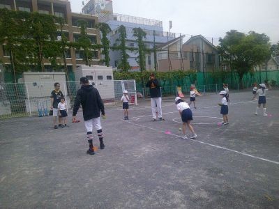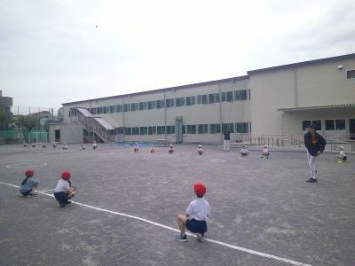 短い距離でキャッチボール、だんだん離れていきます。「相手が捕れるように投げることが大切。今日の練習のテーマは「おもいやり」」というアドバイスもありました。最後は投げて捕ることを基本にしたゲーム。みんなで大いに盛り上がっていました。