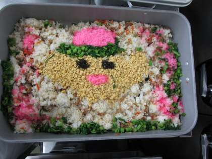 ひな祭りは女の子が元気で幸せでありますように、とお祝いします。ちらし寿司は春が旬の菜の花、卵、たらでんぶを散らして、一之江小学校のキャラクターのいっちーを描きました。「三色白玉」のピンクには苺、緑には抹茶を入れました。