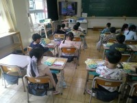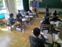 国語でひらがなの練習が進む1年生。練習していた文字は「こ」。「真ん中に○が入るような形」と言った子がいました。そうした文字の特徴を押さえながら、指で空書き、そして鉛筆で。毎日練習を重ねています。